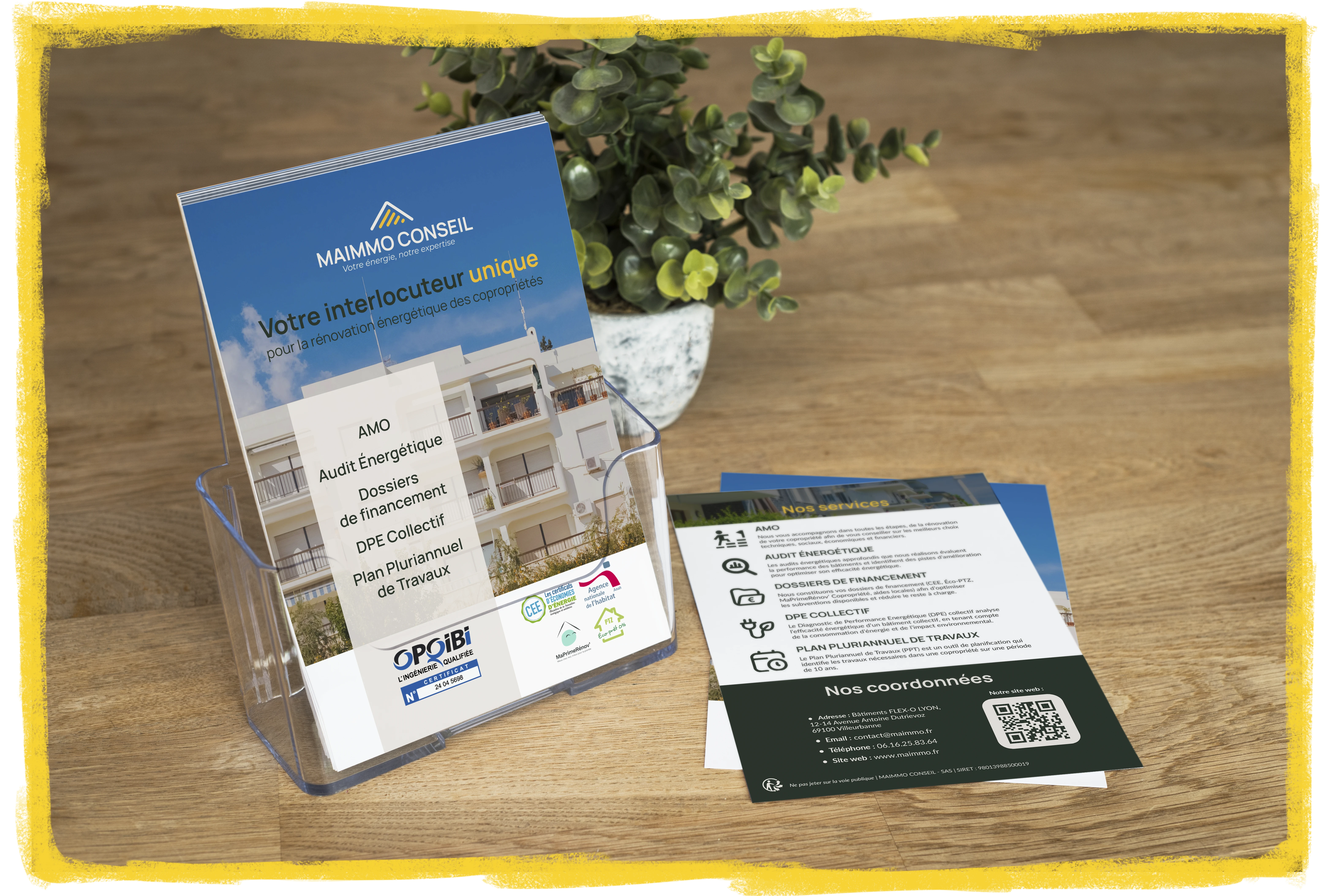 Maimmo Conseil avait besoin de supports clairs et pédagogiques pour expliquer les subventions CEE et MaPrimeRénov’ Copro aux copropriétaires. J’ai conçu deux plaquettes explicatives à la fois esthétiques et structurées, en adaptant les visuels à notre univers graphique.