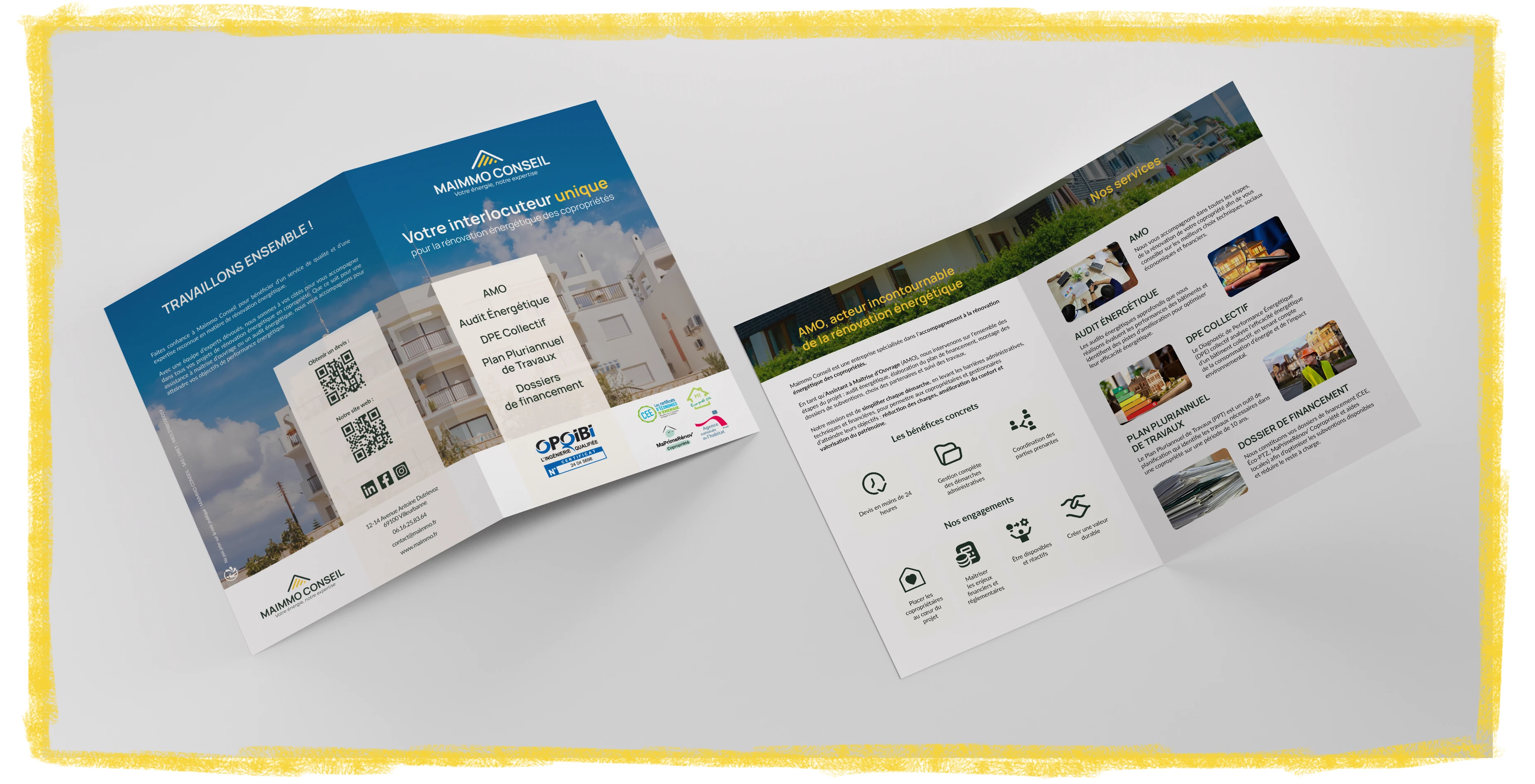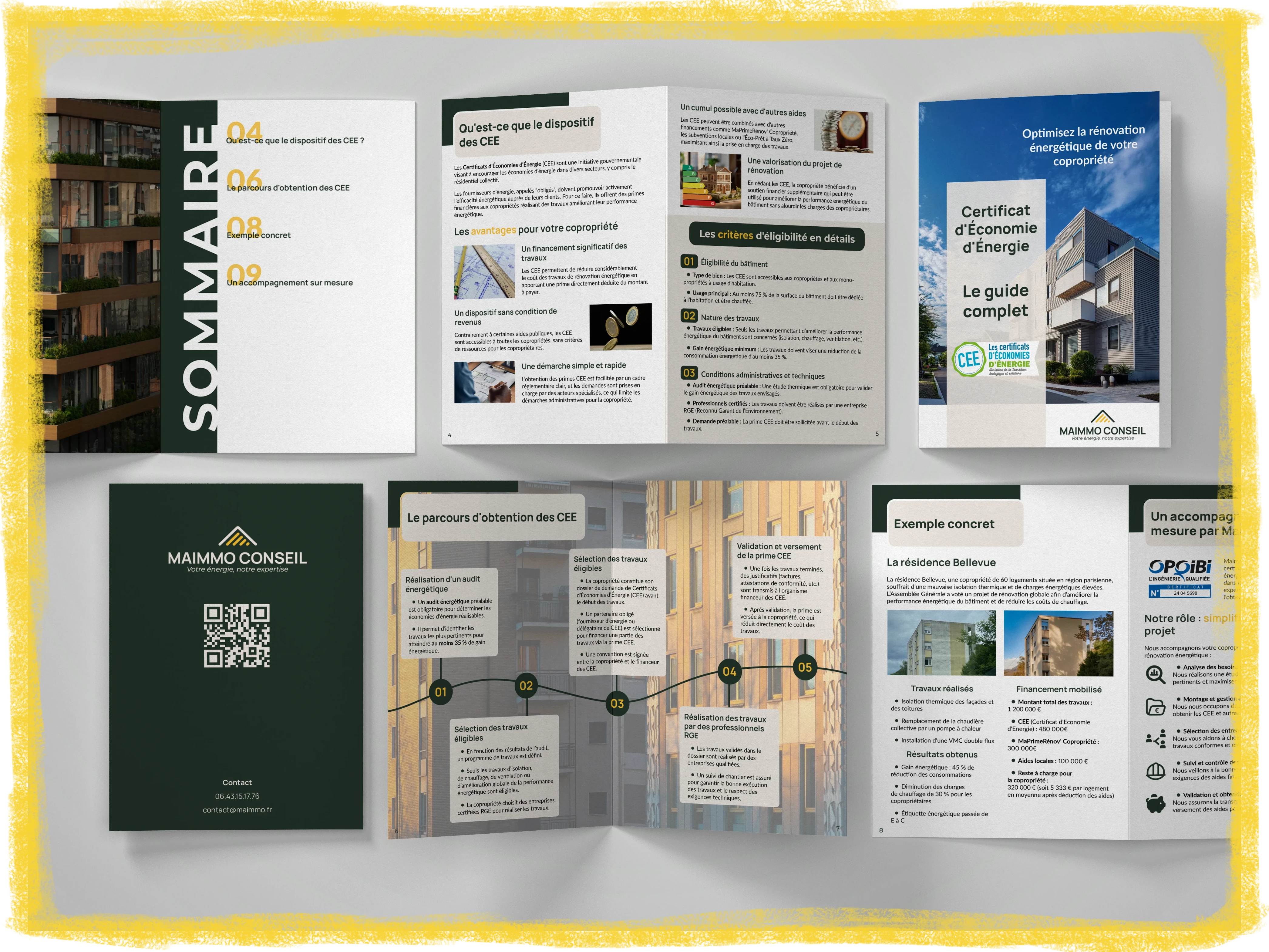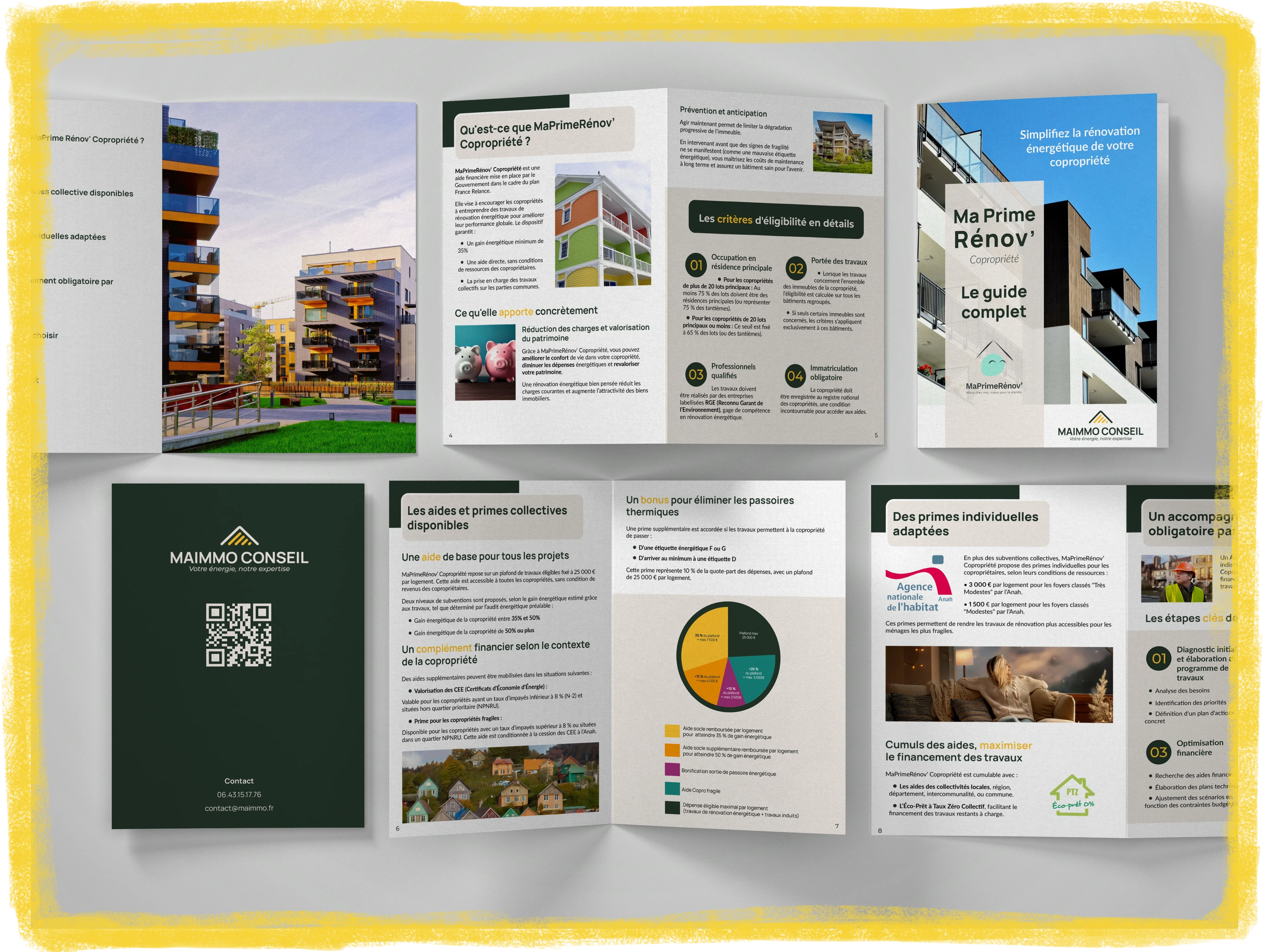 Maimmo Conseil avait besoin de supports clairs et pédagogiques pour expliquer les subventions CEE et MaPrimeRénov’ Copro aux copropriétaires. J’ai conçu deux plaquettes explicatives à la fois esthétiques et structurées, en adaptant les visuels à notre univers graphique.