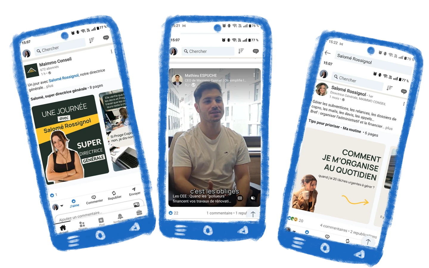 Mon rôle a été de structurer toute la stratégie des réseaux sociaux : création des comptes Facebook et Instagram, définition de la ligne éditoriale, et mise en place d’un planning de publication. Je m’occupe désormais de tout : choix des sujets (validé ensuite pas Mathieu), rédaction des posts, création des visuels, et publication pour le CEO (Mathieu) et la directrice générale (Salomé).
