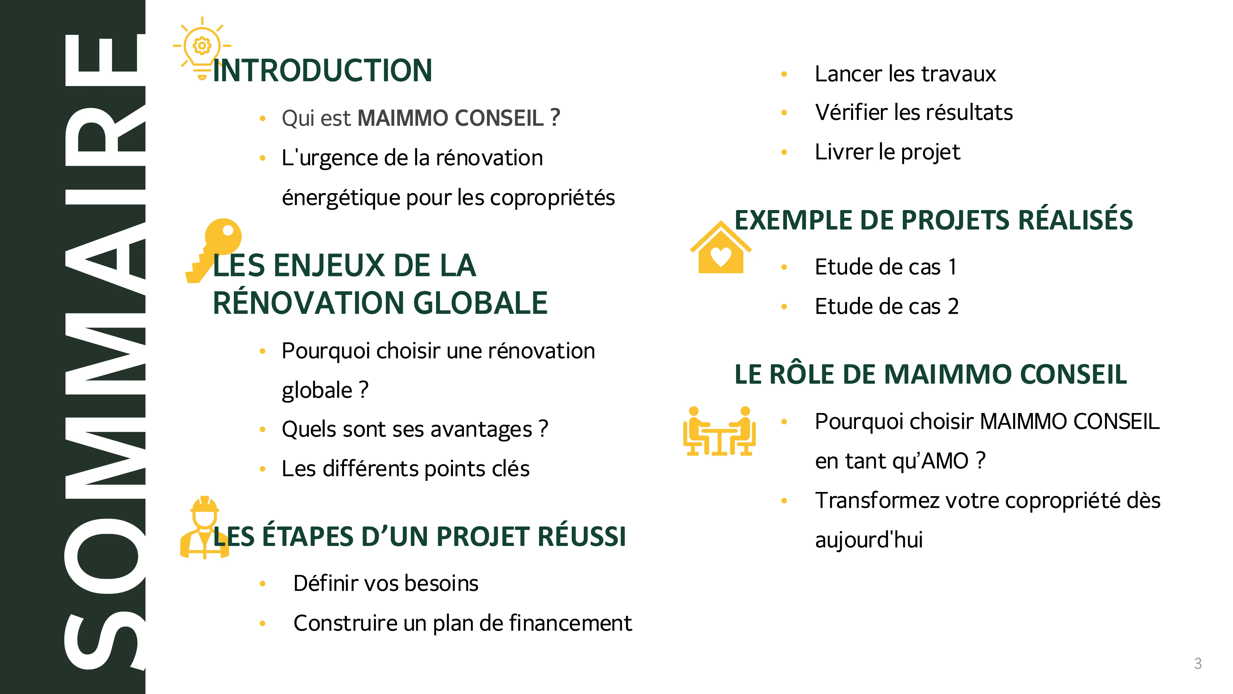 Maimmo Conseil ambitionne de devenir un acteur référent de l'accompagnement à la rénovation énergétique des copropriétés, en démocratisant l’accès aux dispositifs d’aide et en simplifiant un processus souvent complexe et technique. Sa vision repose sur un triptyque fort : pédagogie, proximité, performance.