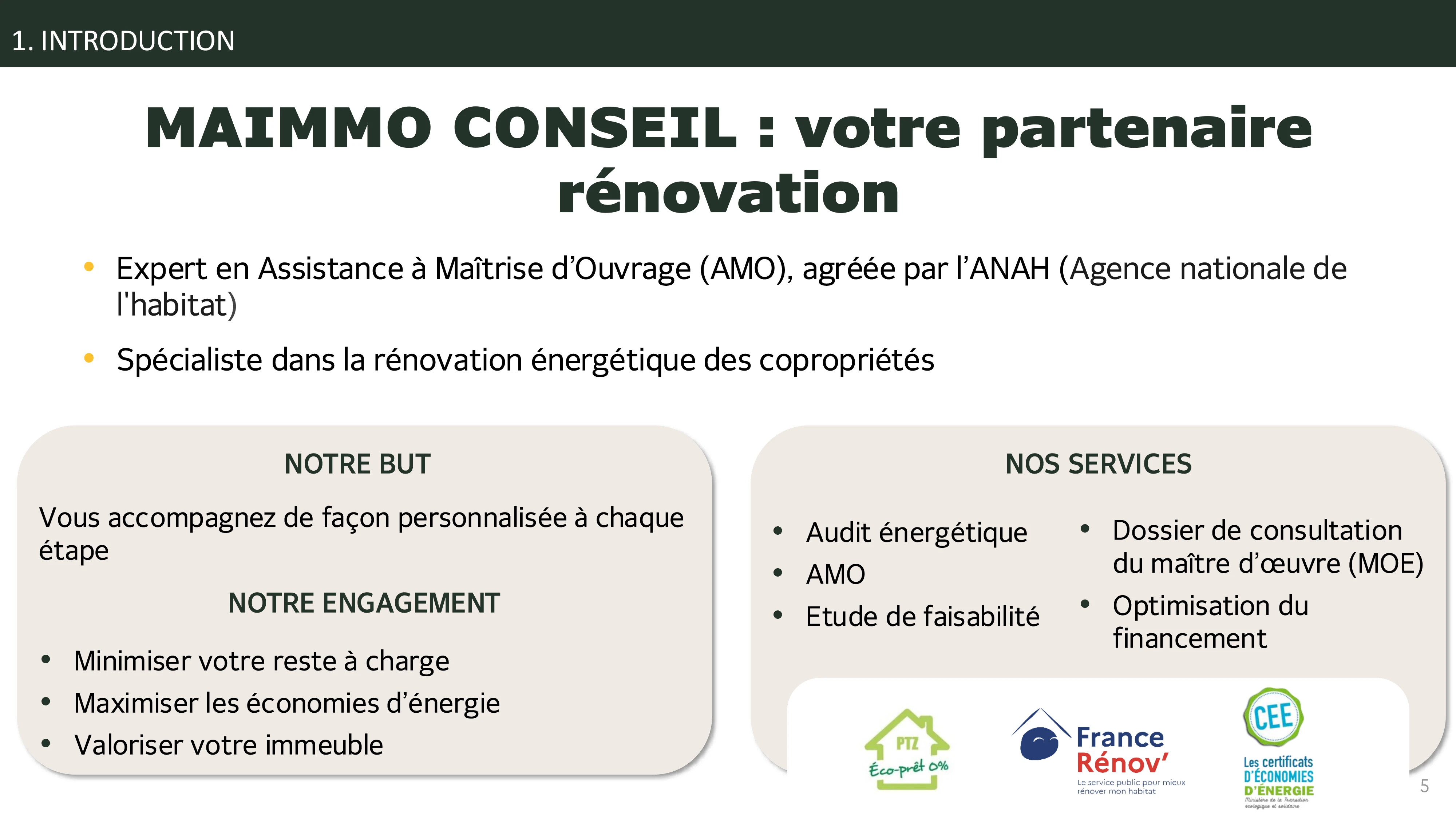 Maimmo Conseil se positionne comme une startup experte et engagée dans l’accompagnement des copropriétés pour leurs projets de rénovation énergétique, avec une approche à la fois technique, financière et humaine.